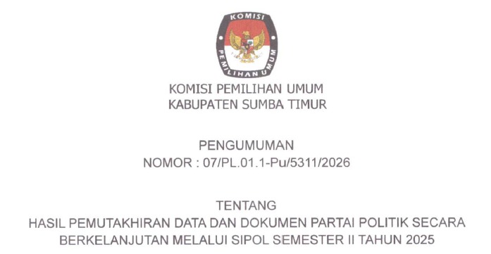 Kegiatan pemutakhiran data berkelanjutan ini merupakan amanat undang-undang untuk memastikan pembaharuan data partai politik peserta pemilu di tingkat kabupaten. Berdasarkan hasil verifikasi terhadap data dan dokumen yang tercatat dalam SIPOL selama periode Semester II Tahun 2025, KPU Kabupaten Sumba Timur merilis status pemutakhiran dari 76 partai politik yang terdaftar.
