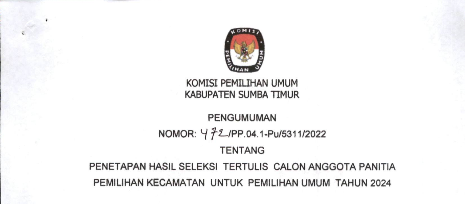 Pengumuman Nomor : 472/PP.04.1-PU/5311/2022 Tentang Penetapan Hasil Seleksi Tertulis Calon Anggota Panitia Pemilihan Kecamatan untuk Pemilihan Umum Tahun 2024