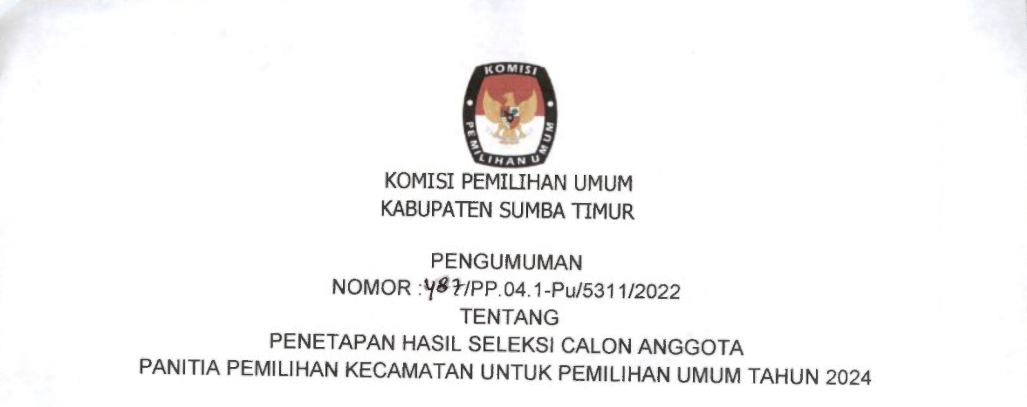 Pengumuman Nomor : 487/PP.04.1-PU/5311/2022 Tentang Penetapan Hasil Seleksi Calon Anggota Panitia Pemilihan Kecamatan untuk Pemilihan Umum Tahun 2024
