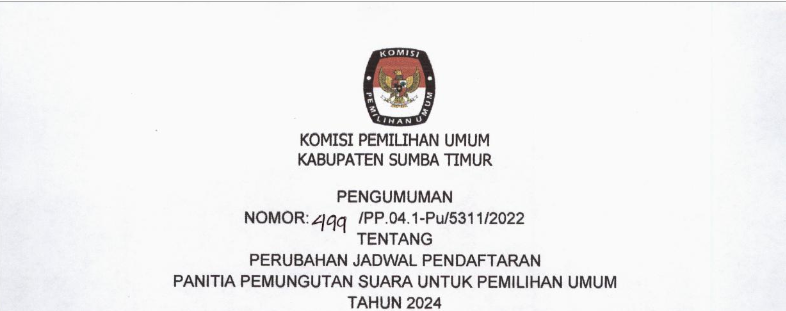 Pengumuman Nomor: 499/PP.04.1-Pu/5311/2022 tentang Perubahan Jadwal Pendaftaran Panitia Pemungutan Suara untuk Pemilihan Umum Tahun 2024