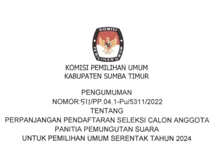 Pengumuman Nomor : 511/PP.04.1-Pu/5311/2022 tentang Perpanjangan Pendaftaran Seleksi Calon Anggota Panitia Pemungutan Suara untuk Pemilihan Umum Serentak Tahun 2024